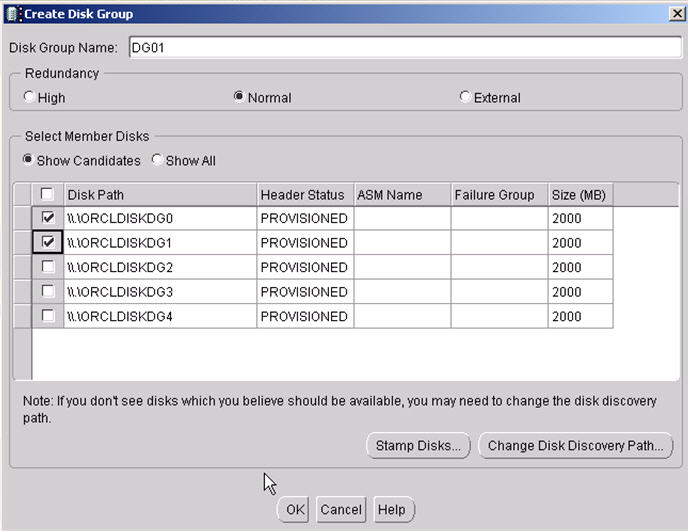 Het aanmaken van de ASM instance is een vrij eenvoudig proces. Zelfs het toevoegen en converteren van de ASM disks naar diskgroups is kinderspel. Bij het definiëren van de diskgroups in dbca worden de beschikbare ASM disks getoond. Deze kunnen een-op-een of gegroepeerd worden benoemd als een diskgroup. Bij het aanmaken van een ASM diskgroup kan worden ingesteld welke vorm van redudancy gebruikt moet worden. De redundancy vormen worden later in dit Whitebook uiteengezet.
