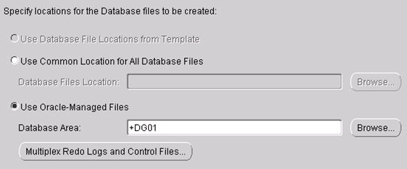 In bovenstaand scherm uit de dbca wordt aangegeven dat de datafiles in diskgroup DG01 moeten worden ondergebracht. De prefix '+' is de manier om aan te geven dat een ASM diskgroup betreft. Naast datafiles kunnen ook ondermeer control files, (archived) redo log files en de gehele 'Flash Recovery Area' worden ondergebracht in een diskgroup. Het aanmaken van een database die gebruik maakt van ASM is niet wezenlijk anders dan een reguliere database. Om deze reden wordt de creatie in dit Whitebook niet verder uiteengezet.