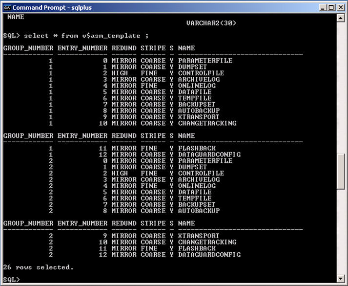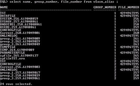 In v$asm_alias is informatie terug te vinden over de files welke in ASM zijn ondergebracht. Omdat meerdere databases op een server gebruik kunnen maken van ASM, worden de files gegroepeerd per database weergegeven (TST is naam van de test-database). Onder de kop DATAFILE worden alle datafiles weergegeven (system, sysaux, undotbs1 en users). De datafile hebben een normale redudancy (allen opgeslagen in diskgroup 1). De controlfile en online redo log files en online redo log files hebben een high reduncancy. De mate van redundancy is terug te vinden in de linkerafbeelding. In onderstaande tabel is zijn de verschillende redundancy mogelijkheden schematisch weergegeven: