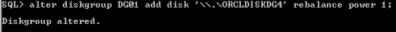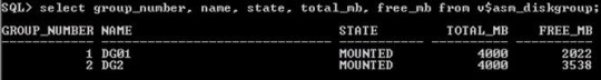 In bovenstaande afbeelding is te zien dat DG01 (Diskgroup 01) bestaat uit de ASM disks ORCLDISKDG0 en ORCLDISKDG1 waarbij er gebruikt wordt gemaakt van 'normale redundancy'.