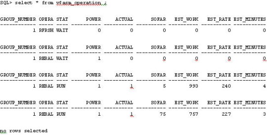 In de kolom EST_MINUTES (meest rechter kolom) wordt de resterende tijd benodigd voor rebalancing aangegeven. In de derde rij wordt de rebalancing daadwerkelijk uitgevoerd; de resterende tijd bedraagt hier 4 minuten; in de rij daaronder nog 3 minuten. Wanneer de rebalancing gereed is, verdwijnt het proces uit bovenstaande view.